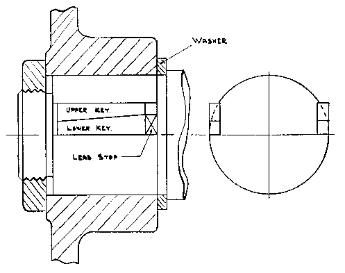 89. AHEAD CLUTCH.--This must be very secure on the crankshaft and should not be removed unnecessarily. It is secured by a nut and two pairs of tapered keys. To slacken the keys, proceed exactly as follows :-with the key punch provided drive in the lower keys slightly. This slackens them and makes it possible to pull off the clutch. When replacing the clutch it is necessary to insert the lead key stops at the back of the lower keys (spares in tool box). If this is not done, removal of the clutch becomes a very troublesome operation.