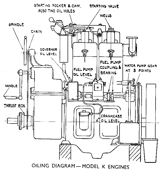 *13. DAILY ATTENTION (see oiling diagram).--(a) Open the cock on the sump of the fuel tank to discharge water and sediment: (b) try the oil test cock (9); (c) fill the oil wells on the cylinders; (d) oil the pump gear at three points, the starting valves, the operating cams, and the coupling of the Bosch pump. Check the level of the oil in the crankcase, reverse gear case and governor (46).