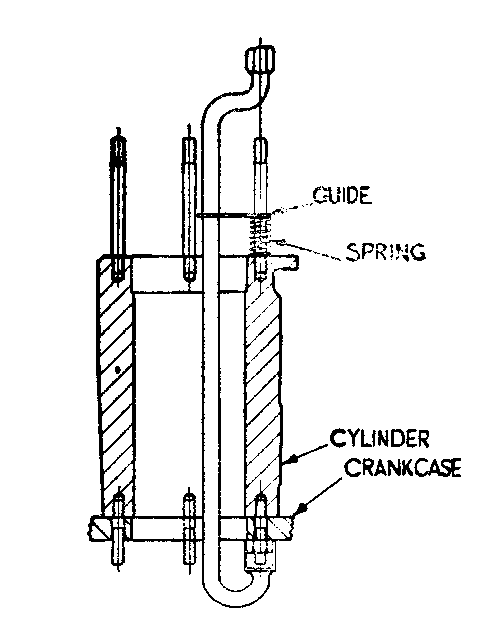 76. VALVES INCLINED TO STICK.--Should a valve stick, the piston will strike it. The oil well on top of each cylinder lubricates the rockers. The surplus lubricates the valve stems. Should a joint between the top of the cylinder and the rocker block become broken or charred, the oil intended for the valve stems might escape.