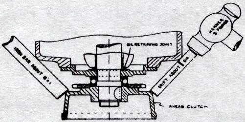 43. CLUTCH.--To remove the clutch from the crankshaft without damage, proceed as follows:-- Remove the nut which retains the clutch, hold a heavy iron bar (like the stock of an anchor) against the clutch on the port side while using a heavy hammer very lightly applied on the starboard side.